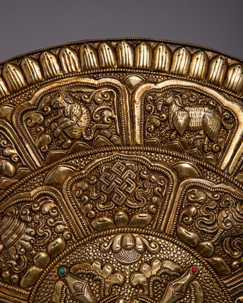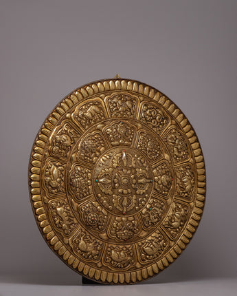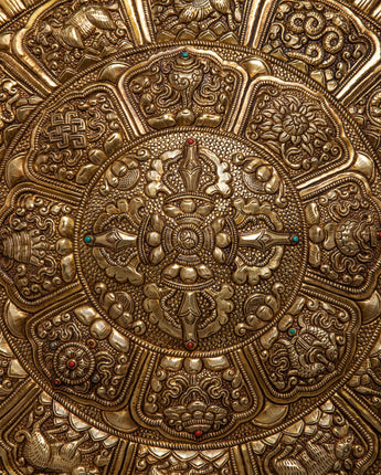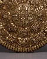 Carefully created by hand from brass, the Brass Crossed Vajra Mandala Wall Hanging is a magnificent example of both artistic refinement and spiritual reverence. The Vishwo Vajra, which represents the combination of wisdom and compassion and is strongly depicted to convey a sense of spiritual strength and harmony, is the center point of the artwork. A number of auspicious symbols surrounds the main theme and decorates the outside, giving the mandala layers upon layers of deep meaning and spiritual importance.