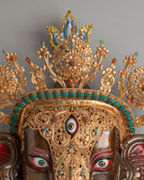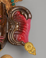This Decorative Ganesha Wall Hanging is a breathtaking piece of art that combines spiritual symbolism with intricate craftsmanship. Standing at 69 cm in height and 44 cm in width, weighing 3.65 kg, this Ganesha wall art features a copper body, fire gold, acrylic colors, and gemstone accents. The figure of Ganesha, the remover of obstacles and the lord of prosperity, is masterfully designed to bring divine energy and positive vibes into any space. The use of oxidized copper adds an antique feel, while the fire gold and gemstones bring vibrancy and luxury to the piece.