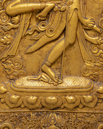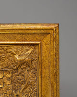 The design of the Dorje Phagmo Thangka features the goddess seated on a lotus throne, radiating divine power and spiritual insight. The intricate details of her figure include dragons, lotus petals, and sacred symbols that enhance the piece's spiritual meaning. Dorje Phagmo’s multiple arms are depicted holding symbols of transformation, wisdom, and protection, each symbolizing her role as a protector and teacher of profound truths. The use of golden accents and rich, vibrant colors in the stone dust epoxy creates a dynamic contrast that draws attention to the goddess’s divine presence.