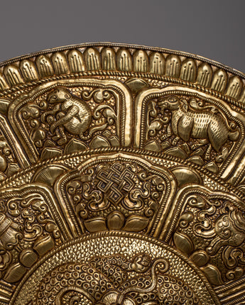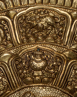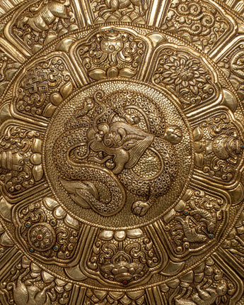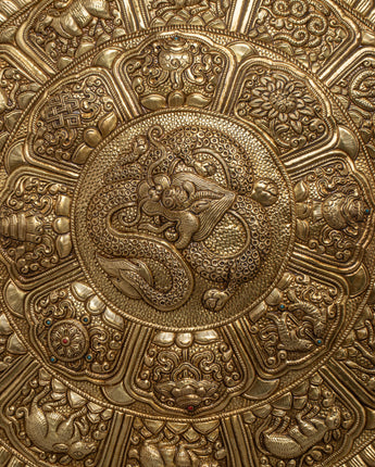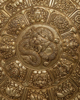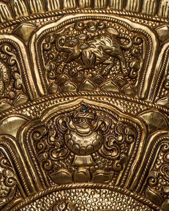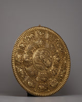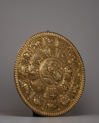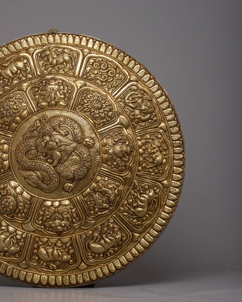 This wall hanging is unique because it has every sign of the Tibetan Zodiac carefully carved along the edge. The artwork is imbued with cultural richness and symbolism through this deliberate integration, transforming it from a dazzling decorative piece into a profound spiritual icon. Evoking a sense of reverence and wonder, the Brass Dragon Wall Hanging Mandala encourages reflection and introspection whether it is hung on the walls of homes, meditation areas, or spiritual sanctuaries.