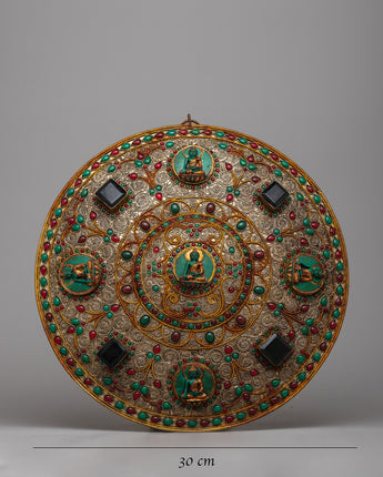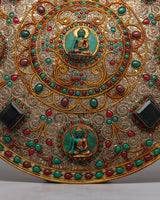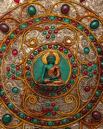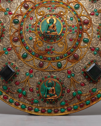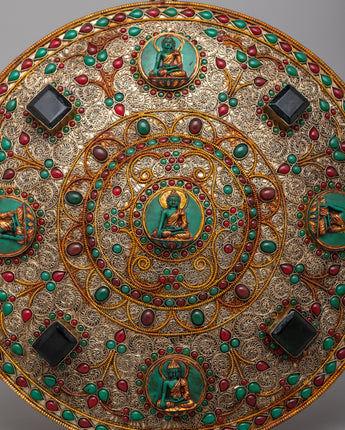 The fine filigree design gives depth and texture to the mandala, increasing its visual appeal and symbolic meaning. Each exquisite pattern and theme woven into the filigree allows visitors to immerse themselves in its complexity, instilling awe and appreciation for the skill that went into its production.