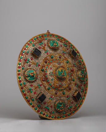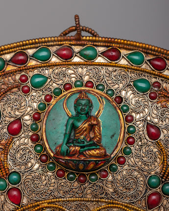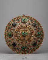 The Filigree Mandala Wall Hanging is a stunning example of artistic brilliance and spiritual expression, delicately fashioned on a copper body with intricate filigree work on the surface. Its elaborate design incorporates an array of precious stones, including resin, panna, ruby, and turquoise, which are carefully inlaid to produce a captivating tapestry of color.