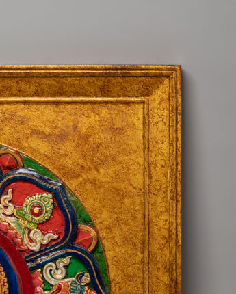 Discover the spiritual essence of the Green Tara Buddhist Wall Hanging, a beautiful handcrafted piece of Tibetan art. Green Tara, the embodiment of compassion and protection, is depicted in vivid detail on this stunning wall hanging. Surrounding her are the eight auspicious symbols, each representing the sacred teachings of Tibetan Buddhism. These motifs carry profound meaning, such as protection, enlightenment, and the path to peace. The Green Tara figure is elegantly framed, making this piece an ideal addition to any meditation or spiritual space. It measures 69cm (Height) x 69cm (Width) and weighs 10.02kg, offering a presence that commands attention while radiating tranquility.