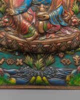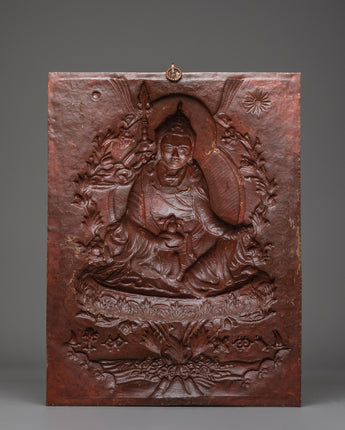 Guru Rinpoche Wall Hanging is a religious depiction of Padmasambhava, the respected teacher of Tibetan Buddhism. This stunning wall art, expertly handcrafted from copper and acrylic color, represents Guru Rinpoche's knowledge, protection, and spiritual power, making it an ideal addition to your meditation room, shrine, or holy altar.