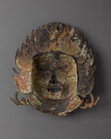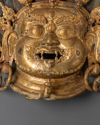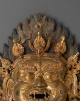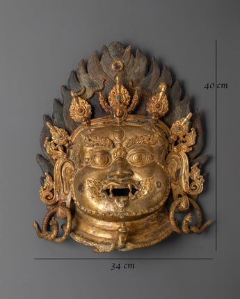 This Handcrafted Bhairab Mask Wall Hanging is a stunning masterpiece of Himalayan workmanship, precisely crafted from copper and finished with bright gold plating. This stunning statement piece weighs 3.70 kg and measures 40 cm in height by 34 cm in width. The mask is further embellished with imitation turquoise and coral stones, which offer both spiritual symbolism and colorful detail. Its artistry exemplifies the skill of artisans who uphold Tibet and Nepal's rich cultural and spiritual traditions.