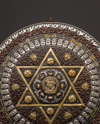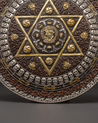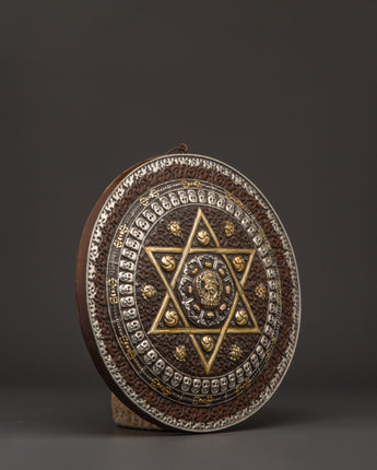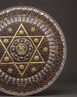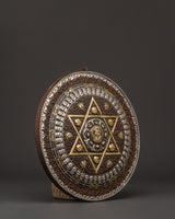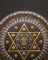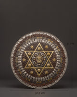 Enhance your spiritual surroundings with our Handcrafted Tibetan Mandala Wall Hanging, a Sacred Geometric Symbol Decor. This gorgeous wall hanging is made of oxidized copper with a silver-plated finish and contains an elaborate sacred geometric pattern representing protection, spiritual harmony, and balance. The primary design is a complex six-pointed star mandala surrounded by fortunate symbols and ornate details. This incredibly appealing wall hanging is 31cm in height and 30.5cm in width and weighs 0.72kg. It is ideal as a focal point in meditation rooms, yoga studios, and spiritual retreats, attracting positive energy and improving mindfulness practices.