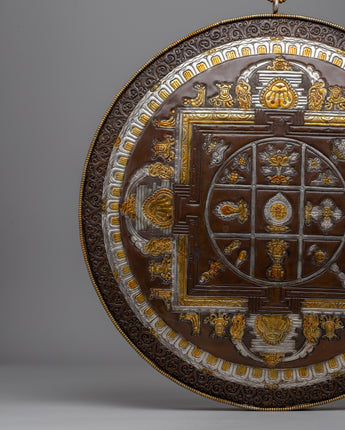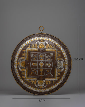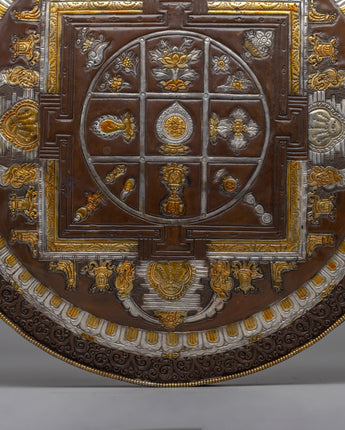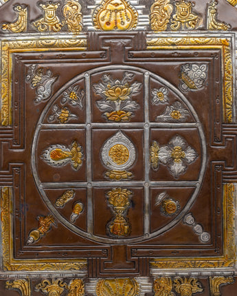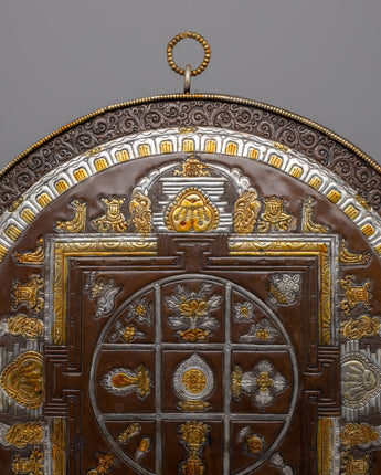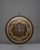 This stunning Handcrafted Wall Hanging Mandala is intricately carved with gold and silver decorations, representing enlightenment and knowledge. Its primary circular design represents the universe, which is surrounded by a square structure with gateways leading to enlightenment. The elaborate themes include the Eight Auspicious Symbols, which represent purity, blessings, and interconnection, such as the lotus flower, clams exterior, and continuous knot.