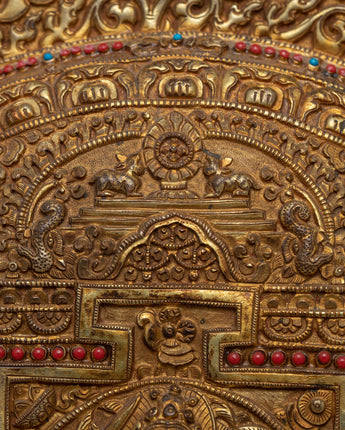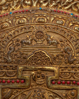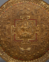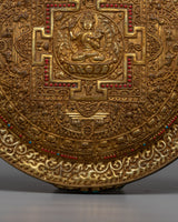 The Buddhist Manjushri Copper Mandala Wall Hanging, created with repoussé art on copper, celebrates Manjushri's wisdom. This technique adds depth and texture, emphasizing the bodhisattva's insight and the intricate mandala that represents the universe and spiritual enlightenment.