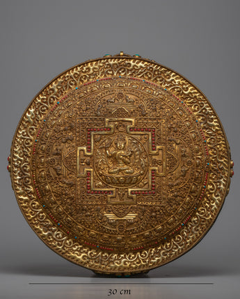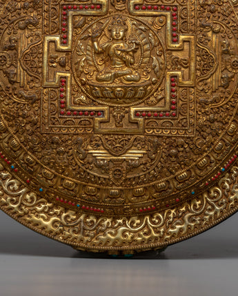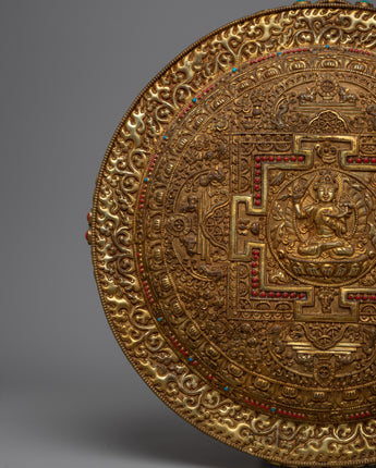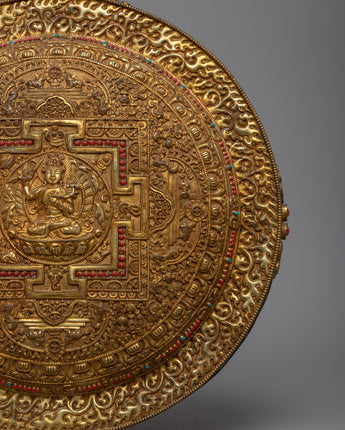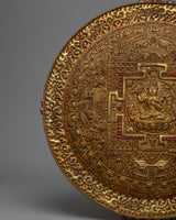 This piece describes Manjushri's essence, encouraging meditation and insight. The repoussé work adds dynamic texture, making the mandala and Manjushri more vivid and encouraging reflection on wisdom and the spiritual journey.