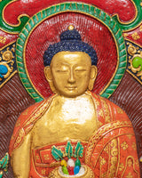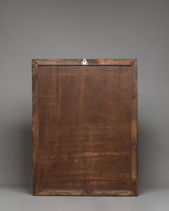 This magnificent Medicine Buddha Thangka wall hanging represents the revered healer of Tibetan Buddhism, offering blessings for physical, mental, and spiritual well-being. Measuring 87cm in height and 67cm in width, and weighing 9.55kg, it is crafted from stone dust with epoxy binding on a wooden backing. The Medicine Buddha — known as Bhaisajyaguru or Sangye Menla — radiates healing energy through his deep lapis blue form, a symbol of spiritual restoration and clarity. Ideal for home altars, meditation rooms, yoga spaces, or healing practice areas, this thangka supports practices focused on inner balance and relief from suffering.