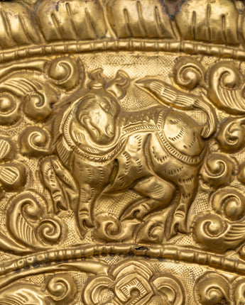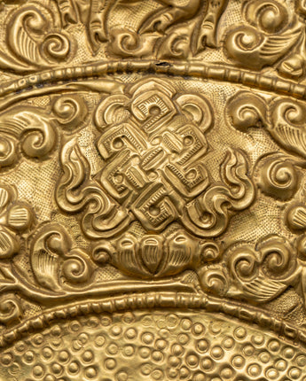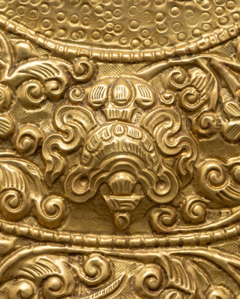 A metal thangka is a type of thangka painting that is made on a metal surface rather than on traditional canvas or paper. Metal thangkas are often made using copper, brass, or silver and are usually decorated with intricate designs and Buddhist iconography using a technique called repoussé. This involves hammering the metal from the reverse side to create a raised relief image on the front. Metal thangkas are known for their durability and are often used in ritual contexts or as decorative pieces in Buddhist homes and temples. They are particularly common in Tibet, where they have been produced for centuries.