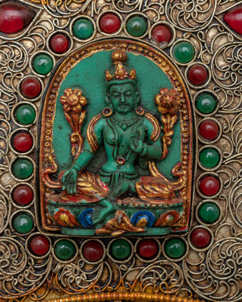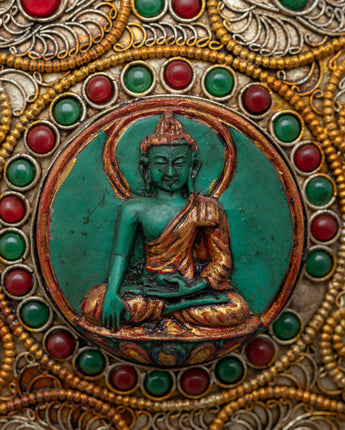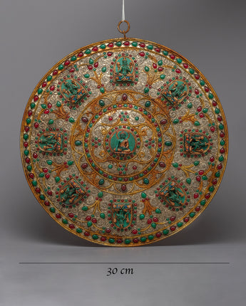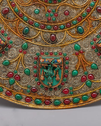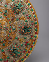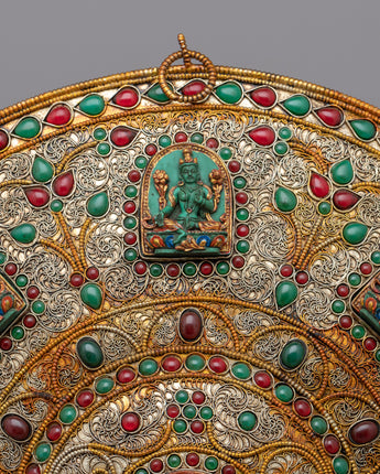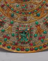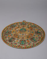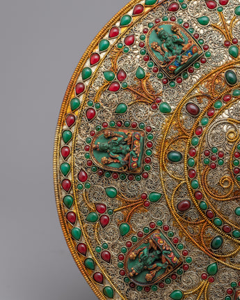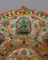 The Round Mandala is a work of art that has been painstakingly constructed on a copper body with superb silver and 24k gold plating. This magnificent artwork features complex details and craftsmanship that are a true testament to the artists' talent. A Deity is expertly created in the middle of the mandala, capturing the essence of divinity and spirituality. The mandala is embellished further with placed gemstones, which lend a touch of sparkle and elegance. This ancient symbol is rich in symbolism and serves as a focal point for meditation and spiritual reflection. The Round Mandala is not only an aesthetic treat, but it also represents cosmic harmony and spiritual transcendence.