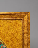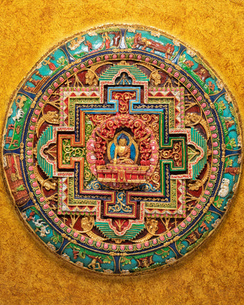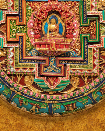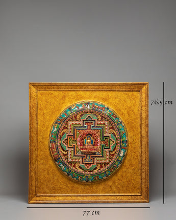 This Sacred Buddha Shakyamuni Wall Hanging is an exquisite and powerful piece of Tibetan art, featuring the historical Buddha, Shakyamuni, seated in the meditative lotus position. Measuring 76.5 cm in height and 77 cm in width, this handcrafted wall hanging is made with stone-dust epoxy binding and features a wooden back for ease of hanging. The Shakyamuni Buddha, the embodiment of enlightenment and wisdom, is at the center of the mandala design, representing the path to spiritual awakening, inner peace, and the attainment of nirvana.