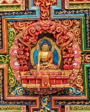 The design of this Shakyamuni Buddha Wall Hanging incorporates vibrant colors and intricate motifs surrounding the central Buddha figure. The mandala represents the cosmos and the interconnectedness of all beings, while the lotus petals symbolizing purity and spiritual growth surround the Buddha. The outer circle is filled with traditional Tibetan patterns and divine symbols, creating a sense of sacredness and unity. The stone dust epoxy binding enhances the detailed carvings, while the gold and jewel accents bring warmth and illumination to the piece, adding spiritual depth and visual harmony.