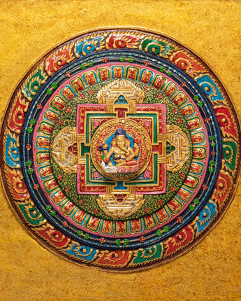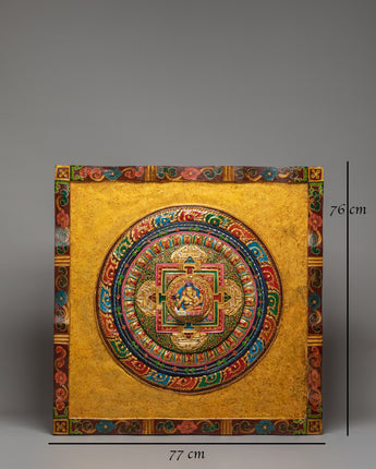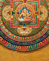 The design of the Ganesh wall hanging is rich in symbolism and craftsmanship. Ganesh is depicted with his iconic elephant head, which represents strength and wisdom. At the same time, his multiple arms hold sacred items such as the modak (a sweet), symbolizing prosperity, and the axe, representing the cutting away of obstacles. Surrounding Ganesh are intricate Hindu motifs and symbolic designs, including lotus petals, elephants, and flowers, all of which enhance the sacred nature of the artwork. The stone dust epoxy gives the piece a timeless, textured finish, while the vibrant colors and gold accents illuminate the divine figure of Ganesh, making it a captivating focal point in any room.