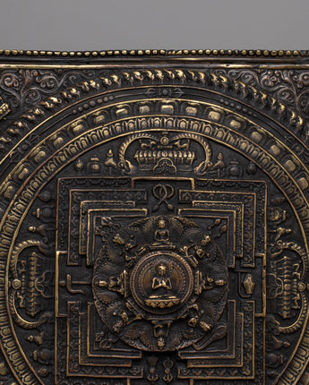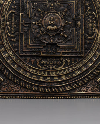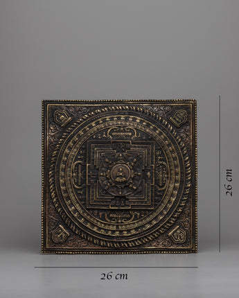 The mandala set, weighing 1.62kg, exudes a presence that is both substantial and graceful. The brass body enhances the design's depth and texture, inviting contemplation and reflection. Its square shape adds a unique twist to traditional mandalas, representing stability and grounding.