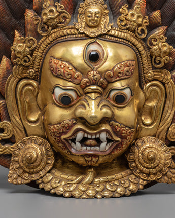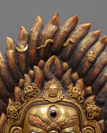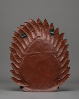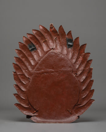 Every aspect of this wall hanging demonstrates intricate creativity and spiritual depth. The fire halo over Mahakala's head denotes cleansing and the burning away of barriers, while his three eyes represent omniscient vision, or the ability to perceive the past, present, and future. The ferocious countenance, complete with bared teeth and bulging eyes, symbolizes the transition of anger into enlightened consciousness. This sculpture, embellished with exquisite details such as flower crowns, serpents, and sacred ornaments, represents the essence of Tibetan metalwork by combining spiritual symbolism with artistic accuracy.