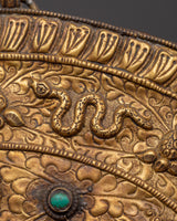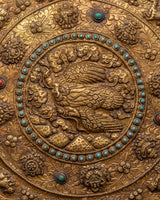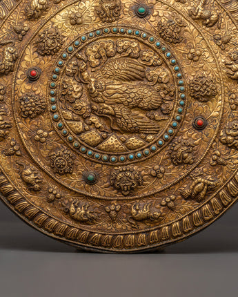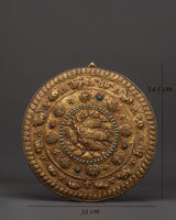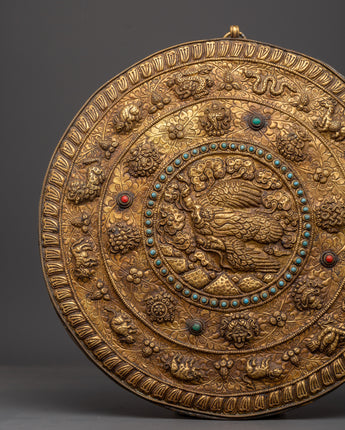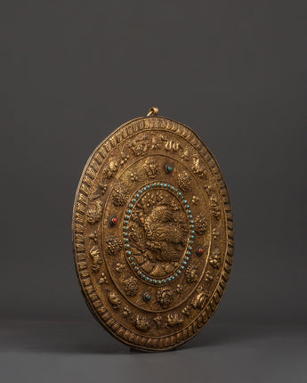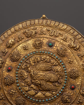 This Tibetan wall hanging features the Garuda, a revered, legendary bird that represents strength, protection, and divine knowledge, surrounded by the Eight Auspicious Symbols and the 12 Zodiac Signs. This finely crafted artwork weighs 0.71 kg and measures 34.5 cm in height and 33 cm in breadth. It is crafted from solid brass and features artificial turquoise and coral stones, which enhance its spiritual energy and visual appeal.