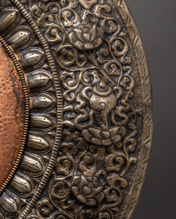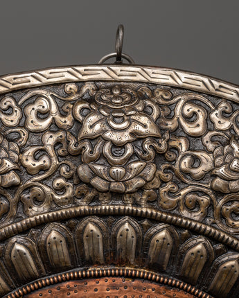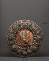 This artwork's iron and copper materials are meticulously detailed, giving it both longevity and a sacred, timeless appearance. The robust iron base is accented by copper accents, which give the design a heavenly shine. The Vajrapani Carved Wall Hanging is not only a beautiful ornamental object, but it also represents protection, strength, and the search of spiritual enlightenment. Its rich meaning and superb craftsmanship make it an ideal addition to any room that seeks spiritual energy and peace.