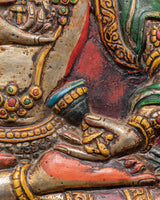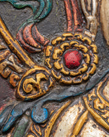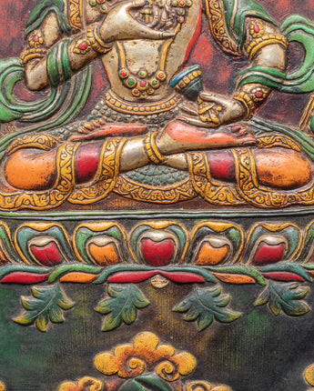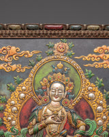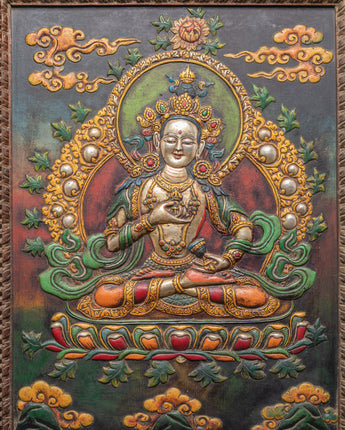 The Vajrasattva Wall Hanging is a potent symbol of purity, healing, and spiritual development. This beautiful piece, measuring 68cm in height and 53cm in width, showcases an elaborately sculpted clay sculpture mounted on a handcrafted oak frame. The brilliant acrylic hues provide depth and richness to Vajrasattva's tranquil face, making this piece an ideal addition to meditation rooms, temples, or sacred locations.