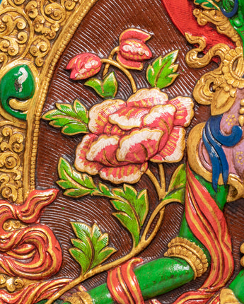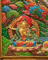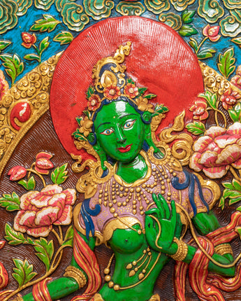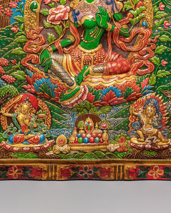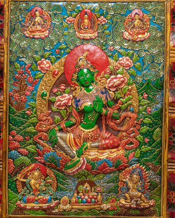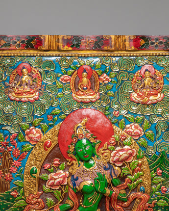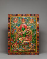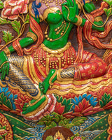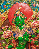 This Green Tara Thangka Wall Hanging is a vibrant Himalayan artwork, crafted from stone dust with epoxy binding on a wooden back, measuring 91.5cm in height and 69.5cm in width, and weighing 13.05kg. The central image of Green Tara radiates compassion and protective energy, surrounded by vivid lotus blooms and ornamental floral motifs. Above her, you will find White Tara, Amitabha Buddha, and Green Tara depicted in graceful harmony, enhancing the sacred visual narrative with their peaceful presence and symbolic guidance.