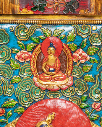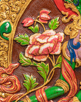 The composition is richly detailed, featuring flowing robes, intricate lotus patterns, and balanced color layers that highlight each element of the Thangka. Below the central figure appear Manjushri, sacred offerings, and Vajrapani, completing the arrangement with motifs representing wisdom, generosity, and spiritual strength. The layered design, luminous hues, and ornate border work create a visually engaging and culturally meaningful piece suitable for meditation rooms, shrines, and curated décor spaces.