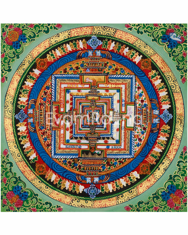 Mandala Thangkas are characterized by elaborate geometric patterns, often featuring a central point surrounded by squares, concentric circles, and other geometric shapes. Each element of the Mandala carries symbolic significance.