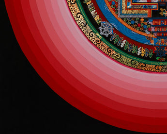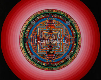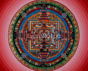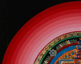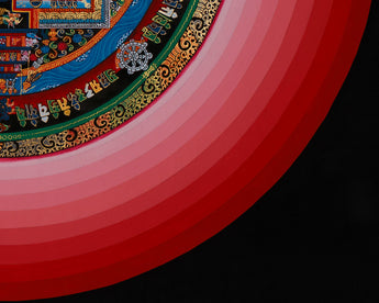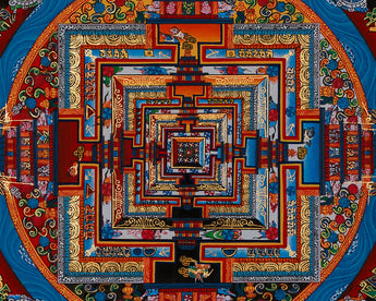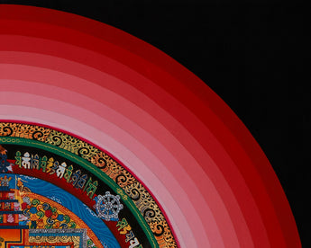 Immerse yourself in the timeless wisdom of the Buddhist Mandala of Kalachakra, which represents cosmic equilibrium, spiritual development, and enlightened consciousness. This mandala is hand-painted on high-quality cotton canvas selected for its durability and capacity to hold intricate details. The artist follows traditional Tibetan techniques passed down through generations, ensuring authenticity. Genuine 24K gold is used to enhance specific areas of the mandala, adding celestial brightness that deepens its symbolism and visual impact. Carefully layered acrylic paints animate sacred geometry and deities with vivid, enduring colors that retain their brilliance over time.