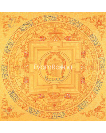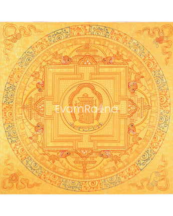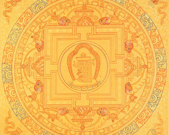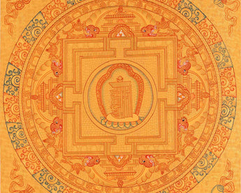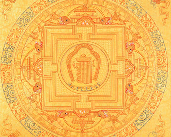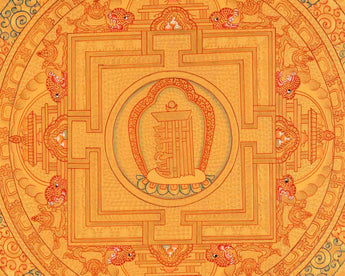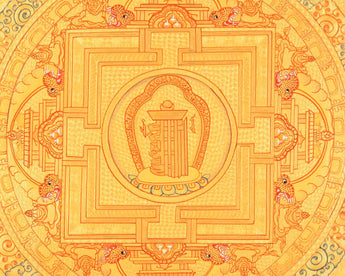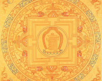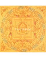 The Thangka's rich gold color and intricate details draw the viewer into a profound meditation experience, serving as a visual guide to inner transformation. Its symmetrical layout and symbolism offer practitioners a way to connect with the divine and explore the depths of their consciousness. The Auspicious Mandala Thangka is not just a work of art; it is a sacred window into the core principles of Buddhism and a source of spiritual inspiration for those who contemplate its intricate details.