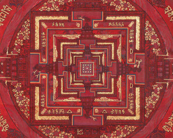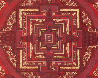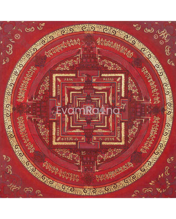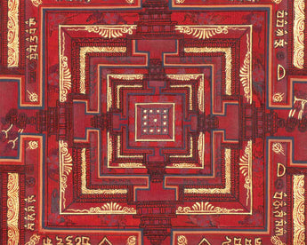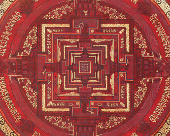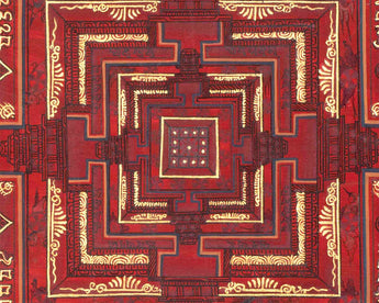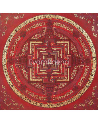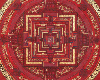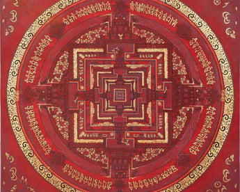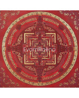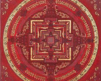 This Kalachakra is depicted with intricate gold designs on a red background, symbolizing spiritual wealth and vitality. Its vibrant colors and detailed patterns serve as a focal point for meditation and visualization, aiding practitioners in deepening their understanding of Buddhist principles and fostering inner peace.