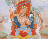 The Print of Manjushri, a beautiful representation of the Bodhisattva of Wisdom, depicted in a serene posture, symbolizing clarity, knowledge, and inner peace. The artwork is printed on high-quality cotton canvas, blending ancient Newari and Chinese artistic elements into a harmonious spiritual composition.