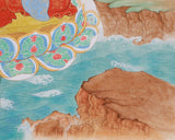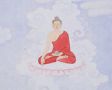 The print features Manjushri seated in vajra posture, holding the sword of wisdom and supporting an utpala flower with the Prajnaparamita scripture. The subtle textures and fine detailing are maintained in the print, offering a rich visual experience. At the top right, Buddha Shakyamuni is depicted as a guiding presence, while the bottom left features the five symbolic offerings—mirror, shell, scarf, incense, and fruit—each representing one of the five senses. The inclusion of atmospheric perspective adds spatial harmony and depth, making this print a stunning visual piece and a meaningful spiritual companion for home, altar, or meditation space.