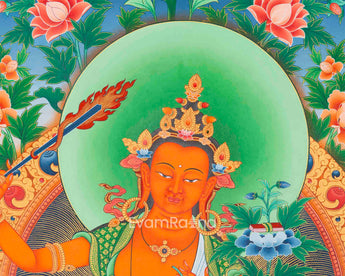 Introducing a breathtaking digital paubha print featuring Manjushri, the bodhisattva of wisdom. This magnificent artwork portrays Manjushri with characteristic attributes, including his sword of wisdom and book of knowledge. The print's vibrant colors and intricate details are a testament to the skill and mastery of the artist. Manjushri is revered in Buddhism as the embodiment of enlightened wisdom, and his presence in your home or spiritual practice can inspire clarity and insight. This paubha print is a sacred and meaningful addition to any collection and a reminder of the profound teachings of the bodhisattva of wisdom. Don't miss out on the opportunity to own this exceptional piece of art.