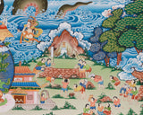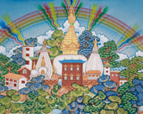One of the holiest Buddhist locations, Swayambhunath Stupa in Kathmandu, Nepal, is beautifully portrayed in the Thangka print, which also features the venerated Bodhisattva of Wisdom, Manjushri. The central stupa is depicted in this piece of art in all its grandeur, standing atop a verdant mountain encircled by a riotous array of temples, trees, and mythological features. Smaller stupas and surrounding structures highlight the stupa's religious significance, while a rainbow surrounds it, signifying enlightenment and spiritual transformation.