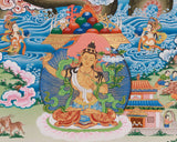 This Thangka is a potent meditation aid in addition to being a visual celebration of the Swayambhunath Stupa because it blends exquisite artistry with profound spiritual symbolism. Viewers are prompted to consider wisdom, the quest for knowledge, and the connection between the material and spiritual realms by the presence of Manjushri and the holy surroundings. The physical and spiritual qualities of one of the most sacred pilgrimage locations are captured in this print, which is a stunning example of Tibetan Buddhist art.
