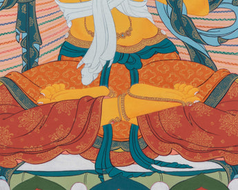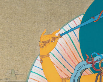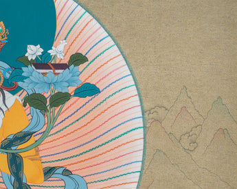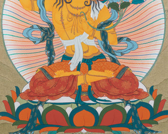 The Thangka Print of the Bodhisattva of Wisdom, Manjushri, embodies the enlightened essence of wisdom and insight within Tibetan Buddhism. Manjushri, revered as the embodiment of transcendent wisdom, is depicted in this exquisite artwork with serene countenance and radiant aura. With his symbolic attributes such as the flaming sword of wisdom and the lotus flower, Manjushri illuminates the path to enlightenment and dispels the darkness of ignorance. Displayed in homes, meditation spaces, or temples, this Thangka Print serves as a potent reminder of Manjushri's transformative teachings and his unwavering commitment to guiding beings towards enlightenment. As practitioners contemplate the Manjushri Thangka Print, they are inspired to cultivate wisdom, insight, and clarity in their own lives, thereby transcending the limitations of ignorance and awakening to the true nature of reality.