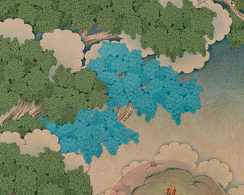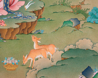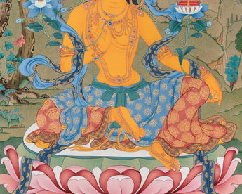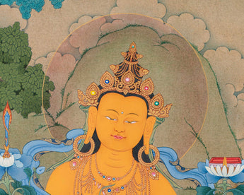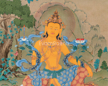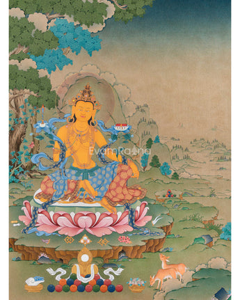 Here, Manjushri, the Bodhisattva of Transcendent Wisdom, is depicted sitting elegantly on a lotus throne. His golden-yellow body shines with the brilliance of supreme knowledge. In his right hand, he holds the flaming sword of wisdom, which cuts through ignorance and delusion. In his left hand, resting on a lotus stem, he grasps a sacred scripture (Prajnaparamita Sutra), symbolizing ultimate truth and transcendental wisdom. He is adorned with jeweled ornaments and silk garments, embodying enlightened perfection. Surrounding him are auspicious symbols, offerings, and gentle animals like deer, adding to the peaceful and scholarly atmosphere of the composition. This Bodhisattva Manjushri print represents clarity, wisdom, and the power of knowledge, making it a powerful guide for study, meditation, and spiritual growth.
