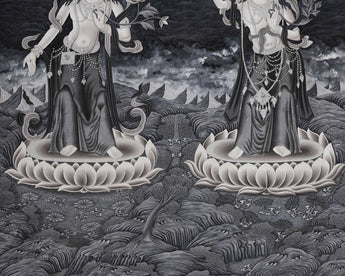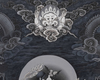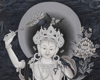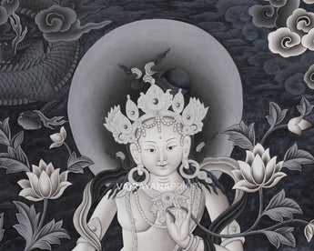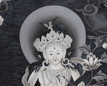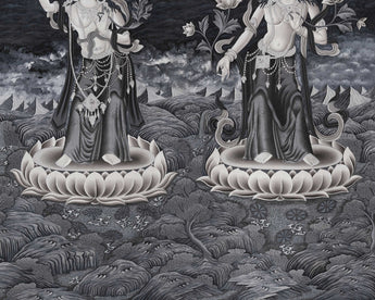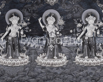 Our White Tara, Manjushri, and Green Tara Standing Thangka Print offers a compelling representation of three significant figures in Buddhist iconography. White Tara, depicted with a serene expression and graceful posture, symbolizes compassion, healing, and longevity. Manjushri, portrayed with a youthful appearance and wielding a sword and a book of wisdom, embodies transcendent wisdom and intellect. Green Tara exudes an aura of compassion and protection. The black and white color scheme of this thangka print adds a timeless elegance and simplicity to the artwork, allowing the intricate details of each figure to stand out with clarity and depth. This monochromatic palette also lends versatility to the print, making it suitable for various interior decor styles and settings. Printed on premium quality canvas, this thangka print can be used in a variety of ways to serve as a focal point for meditation and contemplation, offering visual reminders of compassion, wisdom, and protection. Whether displayed on a wall, altar, or meditation shrine, the White Tara, Manjushri, and Green Tara Standing Thangka Print serves as a powerful tool for connecting with the divine and deepening one's understanding of Buddhist teachings, enhancing spiritual practice and daily life.