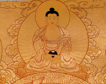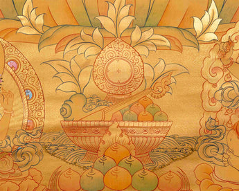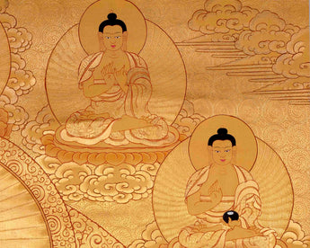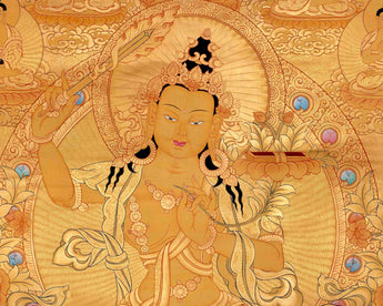 The complete gold appearance of the Manjushree thangka elevates it beyond mere aesthetic beauty, embodying profound spiritual significance. Admired for its rich symbolism and historical connections, it enriches practitioners' understanding of Buddhist teachings. As a revered piece of Buddhist art, it serves as a treasured addition to any collection, inviting contemplation and deepening spiritual practice.