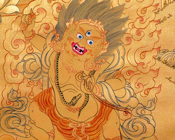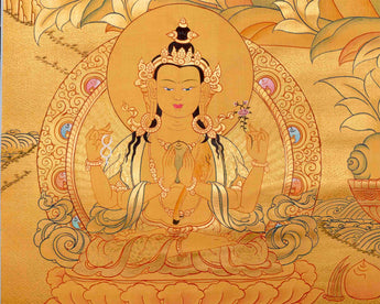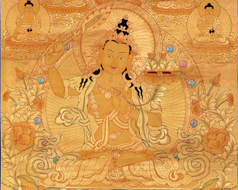 The all-gold design of the magnificent Manjushree thangka showcases the bodhisattva Manjushree in exquisite detail. Covered entirely in gold leaf, the painting radiates divine splendor, capturing the essence of Manjushree, revered as the embodiment of wisdom in Buddhist tradition. Seated on a lotus throne, Manjushree wields a flaming sword in his right hand, symbolizing wisdom that cuts through ignorance, while holding a lotus stem in his left, representing spiritual awakening.