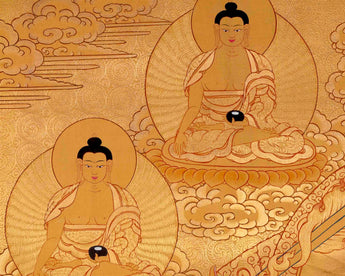 Manjushree, meaning "Gentle Glory," holds a prominent place in Mahayana Buddhism as the personification of transcendent wisdom. Legend intertwines his stories with Buddhism's history, particularly in regions like Tibet, China, and Nepal. One tale recounts Manjushree's role in carving through mountains surrounding the Kathmandu Valley, symbolizing the dawn of civilization and Buddhism in the region. This thangka not only captivates visually but also serves as a potent meditation tool, inspiring practitioners to cultivate wisdom and insight in their spiritual journey.