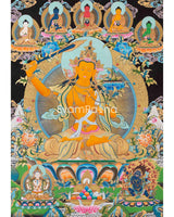 The detailed and harmonious composition of the Manjushri Thangka serves as a powerful tool for meditation, helping to cultivate wisdom, compassion, and inner strength. Whether displayed in a personal shrine or a place of meditation, this thangka invites a deeper connection to the profound teachings and blessings of Manjushri and the accompanying deities.
