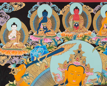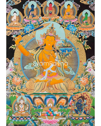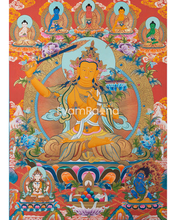 This Manjushri Thangka is a magnificent piece of traditional Tibetan Buddhist art, intricately designed with stunning detail and vibrant colors. Manjushri, the central figure in this thangka, is the bodhisattva of wisdom. Known as the "Gentle Glory," Manjushri is portrayed holding a flaming sword in his right hand, symbolizing the cutting through of ignorance, and a book of wisdom in his left hand, representing the perfection of wisdom (Prajnaparamita). His presence in the thangka signifies the pursuit of knowledge and insight, guiding practitioners on their path to enlightenment.