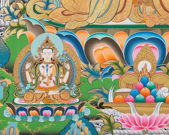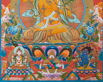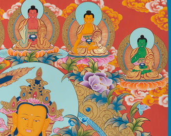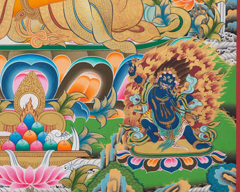 This thangka is of exceptionally high quality, crafted with a beautiful color combination that enhances its visual appeal and spiritual significance. The use of real 24K gold paint throughout the thangka adds a touch of luxury and sanctity, making it not just a piece of art, but a revered object of devotion and meditation.
