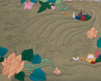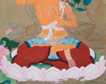 Manjushri, the Bodhisattva embodying wisdom, is honored for his role in dispelling ignorance and guiding toward enlightenment. Holding a sword in his right hand and a scripture in his left, he symbolizes wisdom that cuts through illusion and fosters accurate understanding. In this painting, he is elegantly depicted seated in a peaceful lotus posture, radiating wisdom and compassion. As an inspiring figure, this thangka reminds us of the power of wisdom to overcome challenges and move toward enlightenment, making it a meaningful addition to any space dedicated to spiritual growth.
