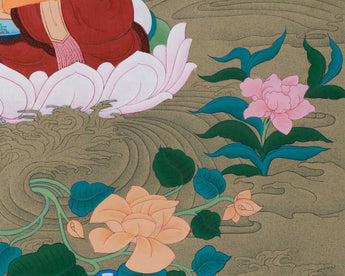 Immerse yourself in the timeless beauty of this Manjushri Bodhisattva painting, which genuinely celebrates spiritual wisdom with its detailed artistry. Hand-painted with care using vibrant acrylic colors and shimmering 24K gold on high-quality cotton canvas, it emanates serenity and strength. Created in the traditional Karma Gadri style, the painting's luminous tones beautifully convey the calm yet powerful presence of Manjushri. The touch of 24K gold emphasizes the symbolic details, infusing the piece with sacred energy. Each brushstroke invites you to feel a deeper connection to the wisdom and peace that this Bodhisattva embodies.