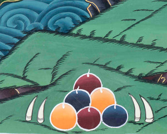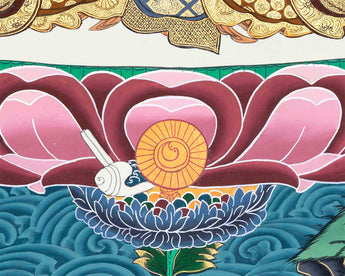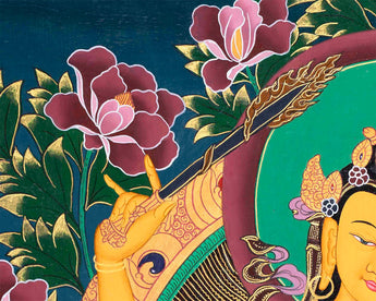 The Thangka is hand-painted with conventional methods and has vibrant, rich colors that have a strong visual effect. It serves as a reminder of how crucial it is to cultivate knowledge and wisdom during one's spiritual path.