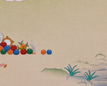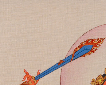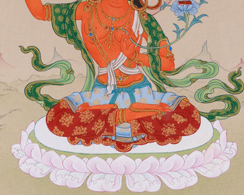 The Manjushri (Jampelyang) Thangka is made from high-quality materials, resulting in a vibrant and enduring piece of spiritual art. The Thangka is painted on cotton canvas, which serves as a base for the exquisite decorations. Natural stone colors are used to create vibrant and earthy tones, adding depth and authenticity to Manjushri's Art. Genuine 24K gold is used to highlight essential elements of the deity, giving the thangka a brilliant and sacred appearance. These materials and techniques, combined with the Karma Gadri style, provide the artwork with artistic and spiritual significance, reflecting centuries of Tibetan Buddhist tradition.