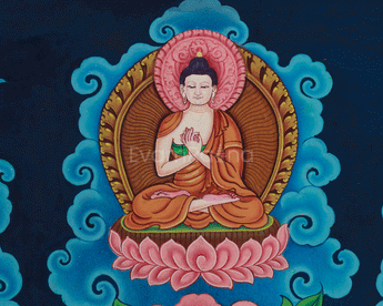 Experience the profound spiritual significance captured in this hand-painted Manjushri Thangka. At the heart of the composition, Manjushri, the Bodhisattva of Wisdom, sits in serene meditation, flanked by his consorts, embodying the perfect union of wisdom and method. These consorts represent the feminine energy that complements Manjushri’s wisdom, highlighting the balance of male and female principles in the pursuit of enlightenment.