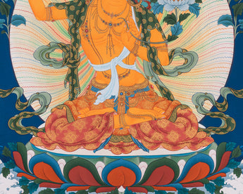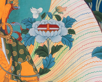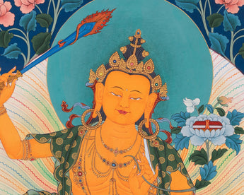 Awaken the boundless wisdom and compassion of Manjushri, the venerable Buddha of Wisdom. The thangka is hand-painted with vibrant acrylic colors and genuine 24K gold, painted in the traditional Karma Gadri Style. It features intricate detailing and rich gold accents and is painted on high-quality cotton canvas for a smooth surface. This timeless piece brings spiritual significance and artistic beauty to your space.
